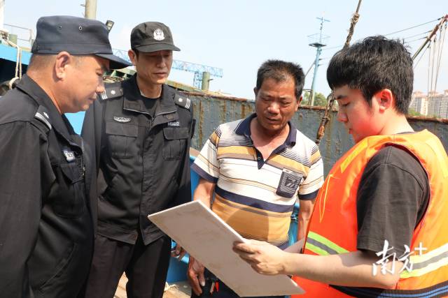 潮南区农业农村局海洋综合执法大队工作人员将休渔期的注意事项明白纸发放给船东。 南方+ 张伟炜 拍摄